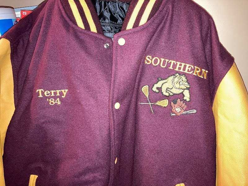 The image features a maroon and gold varsity jacket with embroidered details, including the name "Terry" and the year '84.