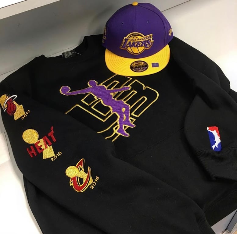 The image features a black sweatshirt adorned with colorful NBA team logos and a purple Los Angeles Lakers cap.