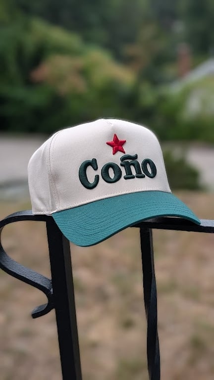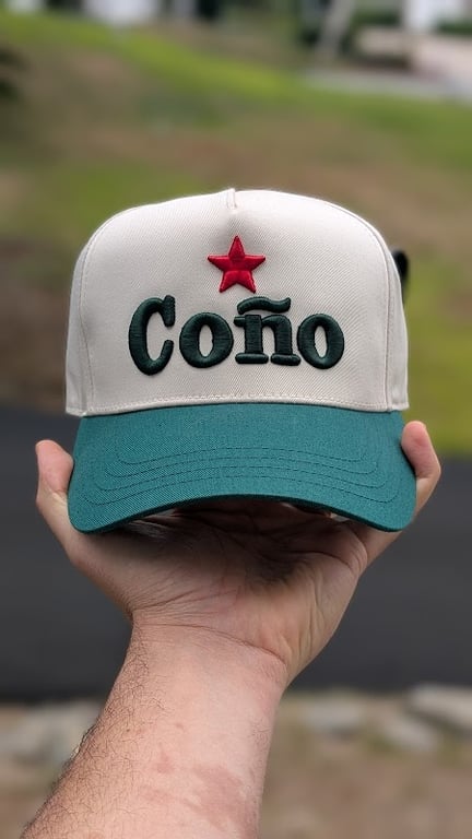 A stylish beige and teal cap features the word "Coño" in bold green letters, accented by a red star.