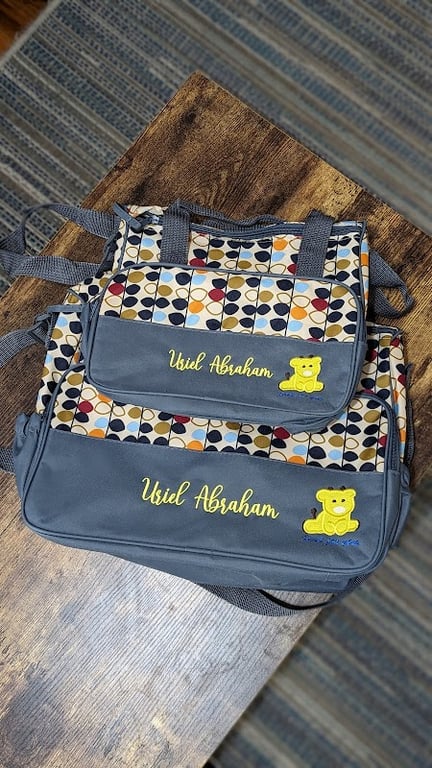 Colorful, patterned sewing bags are displayed on a wooden surface, featuring personalized embroidery with the name "Uriel Abraham" and a cheerful bear design.