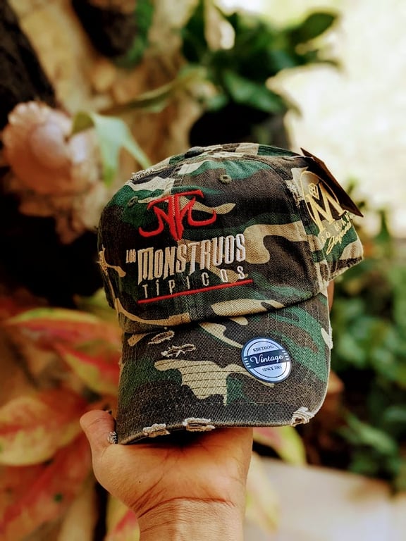 A hand holds a vintage camo cap featuring bold red and white lettering.