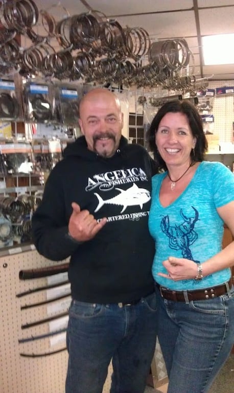 A smiling man and woman pose in a sewing store, surrounded by shelves of sewing supplies and tools, showcasing a welcoming atmosphere.