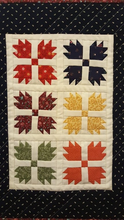 The image showcases a quilt featuring a vibrant pattern of leaves in red, blue, yellow, and green against a dark background.