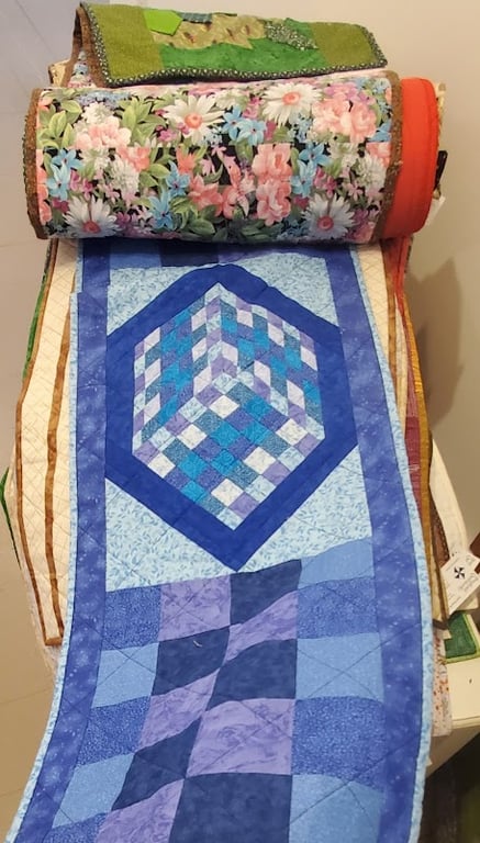 The image showcases a vibrant display of quilts at Brookside Quiltworks, featuring a blue geometric quilt prominently laid out.