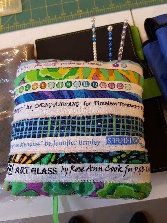 The image features a colorful pincushion adorned with various fabric strips, showcasing vibrant patterns and designer names.