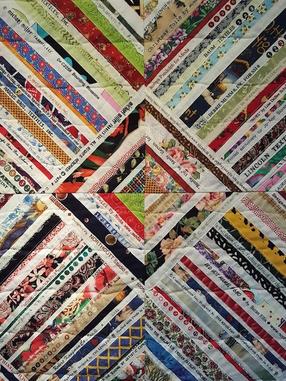 The image showcases a vibrant quilt made from an array of colorful fabric strips, featuring various patterns and textures.