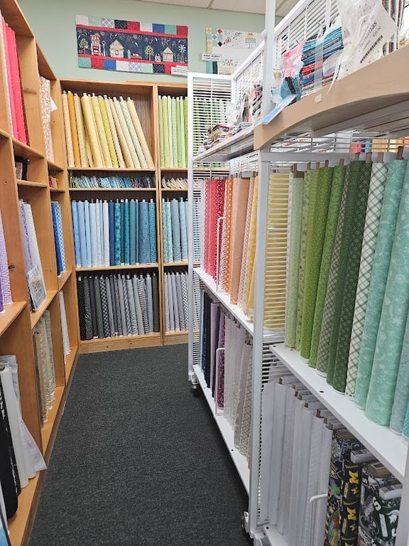 The image shows the interior of Leabu Sewing Center, featuring neatly organized shelves filled with colorful fabric rolls in various patterns.