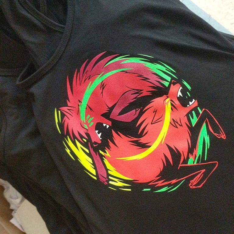 A vibrant black tank top features a colorful graphic of a stylized animal design, showcasing the creative potential of custom apparel at Armadillo Printwear.