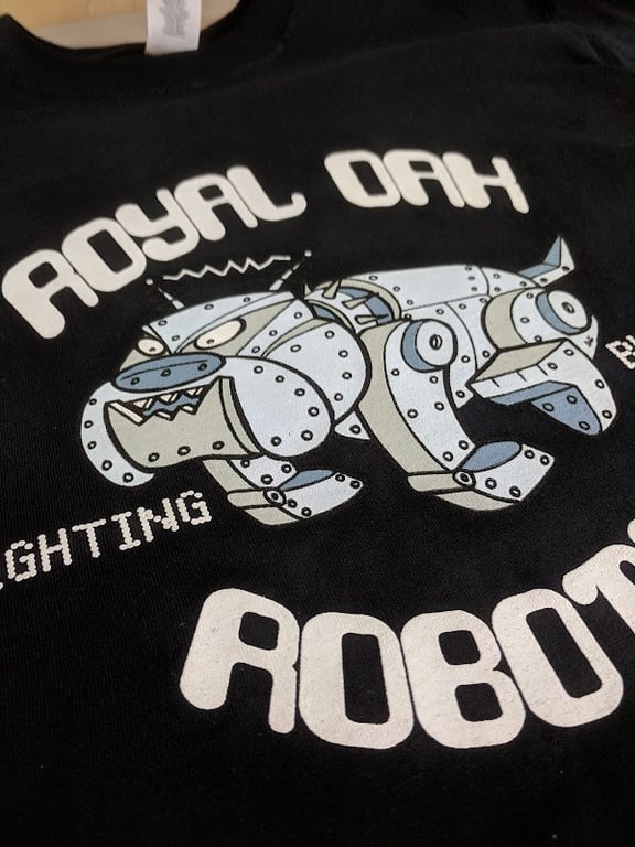 The image features a black t-shirt displaying a playful graphic of a robotic dog, labeled "Royal Dog Fighting Robots.