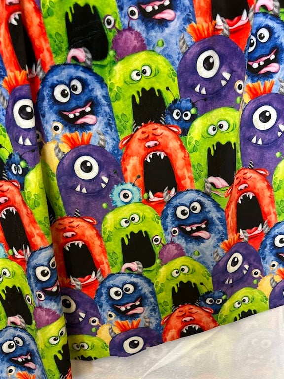 The image features a vibrant fabric covered in colorful cartoon monsters with exaggerated expressions.