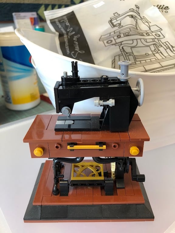 The image features a detailed model of a vintage sewing machine made from building blocks, set against a backdrop of sewing supplies.