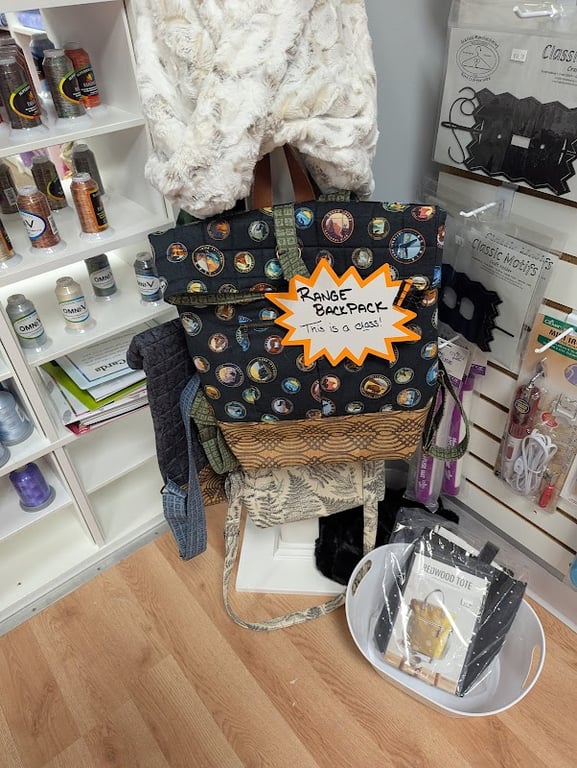 The image showcases a vibrant sewing store display featuring a colorful Range Backpack with a sign indicating it is part of a class.