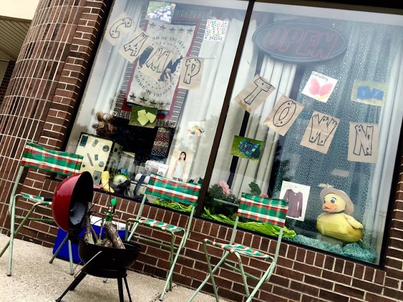 The photo showcases the vibrant storefront of Sew Many Things Sewing Center, featuring a playful "Camp Town" theme.