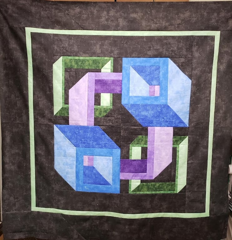 The image features a vibrant quilt displayed prominently, showcasing geometric patterns in shades of blue, green, and purple against a dark background.