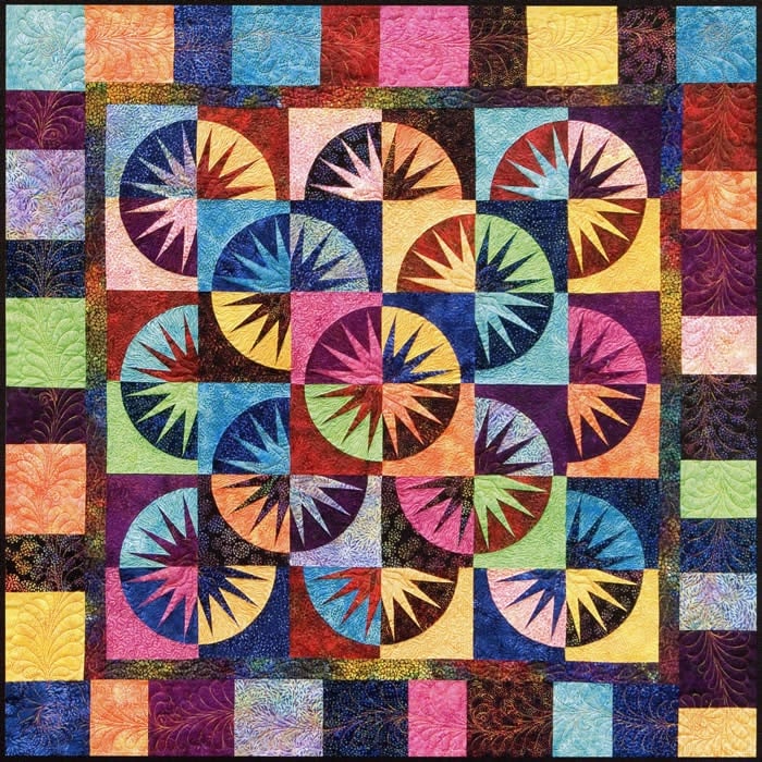 This vibrant quilt features a geometric design with colorful circular patterns and star motifs, showcasing a variety of fabrics.