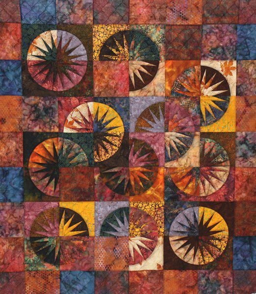 This image features a vibrant quilt with intricate circular patterns and star motifs, showcasing a blend of rich colors like orange, purple, and blue.