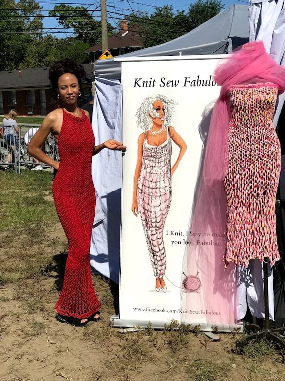 A woman in a red crocheted dress stands beside a display featuring a colorful fashion illustration and a pink, knitted dress.