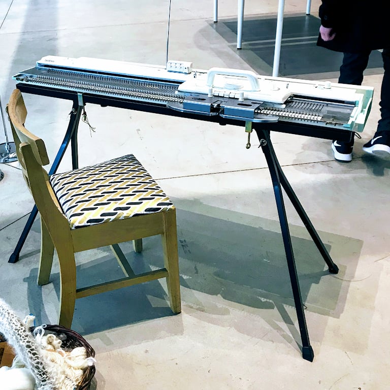 The image shows a knitting machine set up on a folding table beside a chair with a patterned cushion.