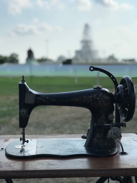 The image features a vintage sewing machine prominently displayed on a wooden table, set against a blurred outdoor background.