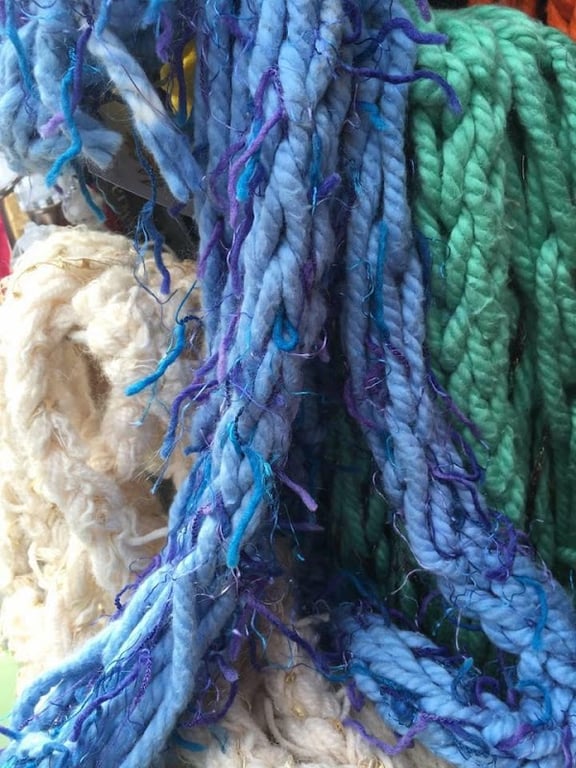 The image showcases vibrant yarns in various colors, including blue, green, and cream, displayed in a sewing store.