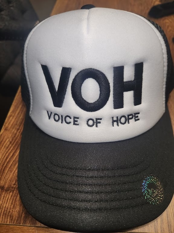 A black and white trucker hat displays the embroidered text "VOH Voice of Hope.