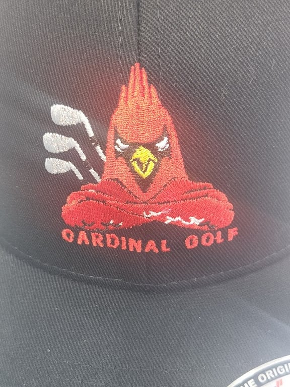 This image features a black cap adorned with a vibrant red embroidered cardinal logo, representing "Cardinal Golf." The design includes golf clubs, emphasizing its sporty theme.