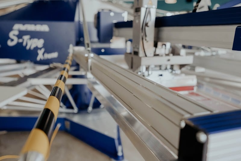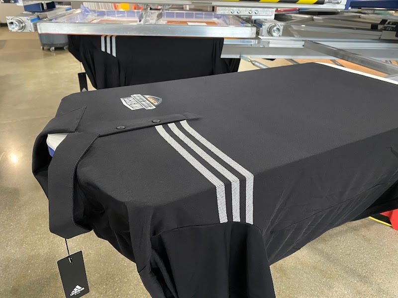 A black polo shirt with three white stripes and a logo is displayed on a printing press in a well-lit sewing store.