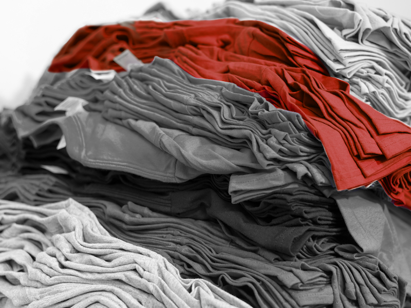 A vibrant stack of folded fabrics in various shades of gray, with striking red pieces prominently displayed, creates an eye-catching focal point in the sewing store.