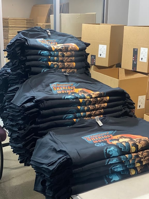 A stack of neatly folded black t-shirts featuring a colorful graphic design is displayed in a sewing store's interior.