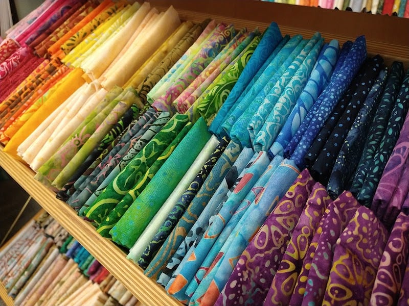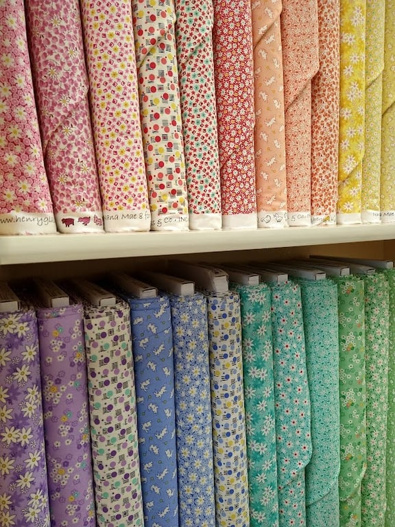 The image showcases a vibrant display of folded fabrics in various colors and patterns, neatly arranged on wooden shelves in a sewing store.