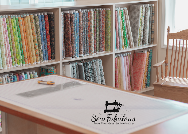 The image showcases the interior of Sew Fabulous, a sewing store filled with sewing machines and equipment.