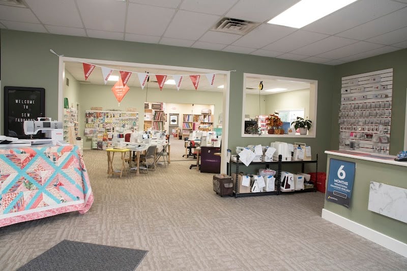 The image shows the interior of Sew Fabulous, a sewing store featuring colorful fabrics, sewing machines, and organized displays.