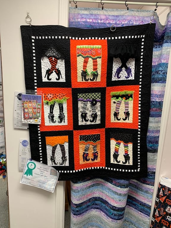 A colorful quilt featuring whimsical designs hangs on the wall of 2nd Street Quilt Shop, surrounded by vibrant fabric displays.