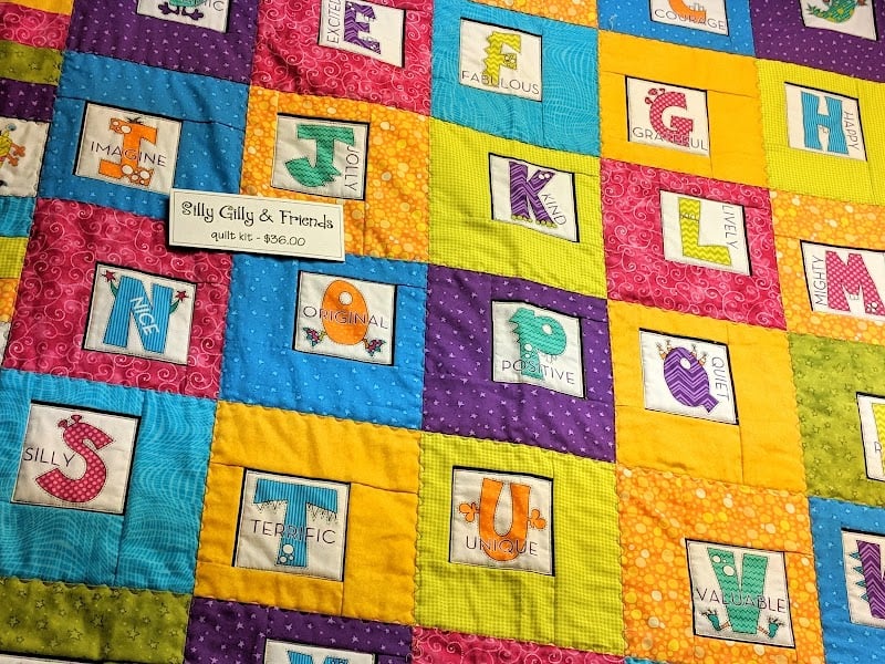 The image features a vibrant quilt kit titled "Silly Gilly & Friends," showcasing colorful squares with letters and words.