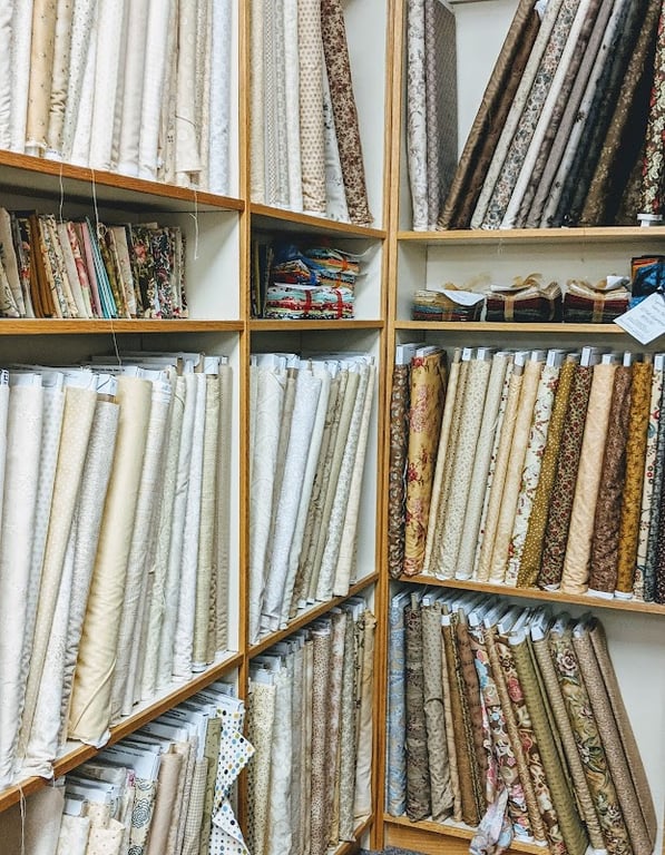 The image shows a cozy interior of Bits 'n Pieces sewing store, featuring neatly arranged shelves filled with various rolls of fabric in neutral and floral patterns.