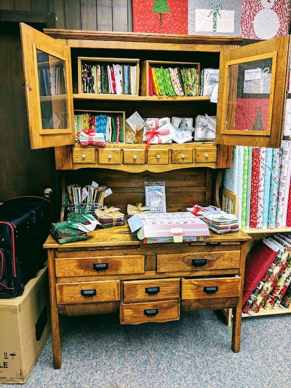 The image showcases a wooden display cabinet filled with colorful fabrics and sewing supplies, including neatly wrapped bundles and spools.