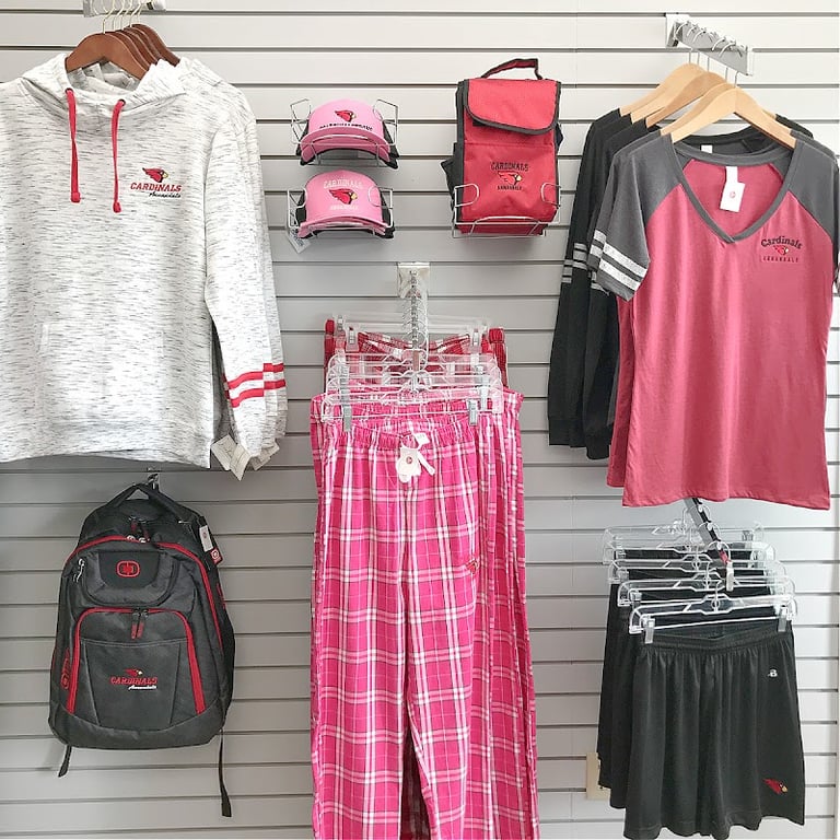 The image showcases a display of apparel at Annandale Embroidery & Apparel, featuring a gray hoodie, pink plaid pants, and various caps.