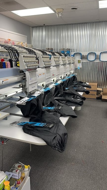 The image shows a sewing store interior featuring multiple embroidery machines lined up on a table, with black garments ready for customization.