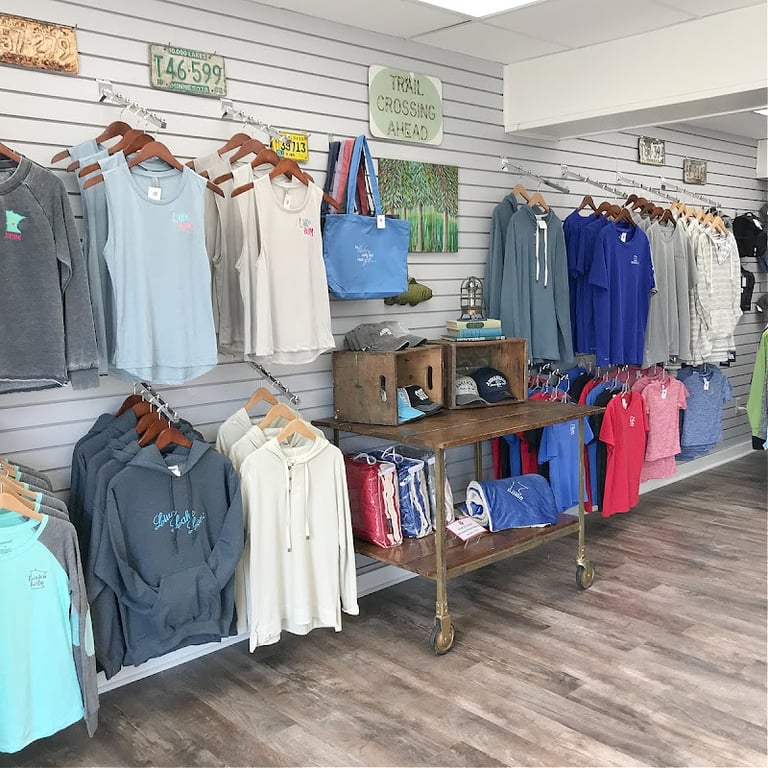 The image showcases the interior of Annandale Embroidery & Apparel, featuring neatly arranged apparel on wooden hangers.