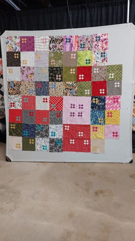 A vibrant quilt display features an array of colorful fabric squares in various patterns, showcasing the diverse selection available at GE Designs sewing store.