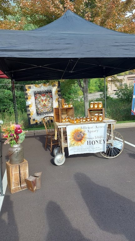 A vibrant outdoor market stall features jars of honey displayed on a rustic cart, surrounded by wooden crates and a flower arrangement.