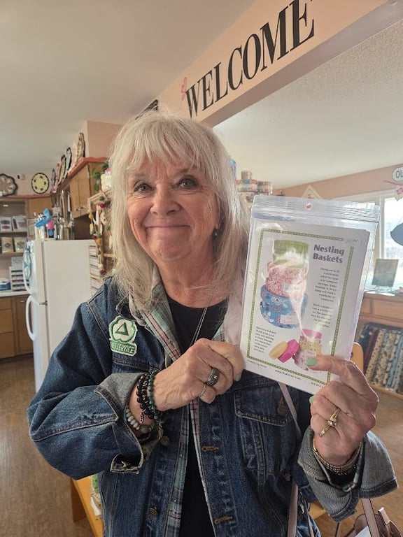 A smiling woman holds a sewing pattern for "Nesting Baskets" in a cozy quilt shop.
