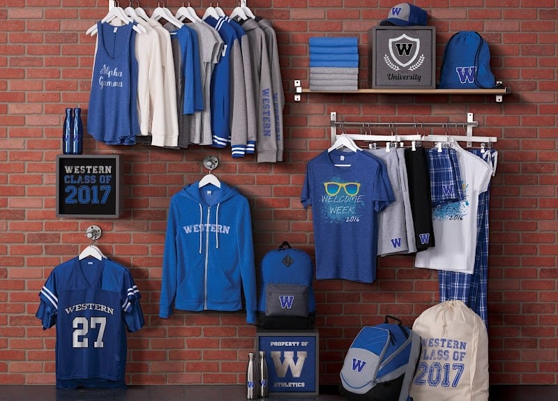 The image showcases a vibrant display of custom apparel, including hoodies, t-shirts, and accessories, all featuring a blue and gray color scheme.