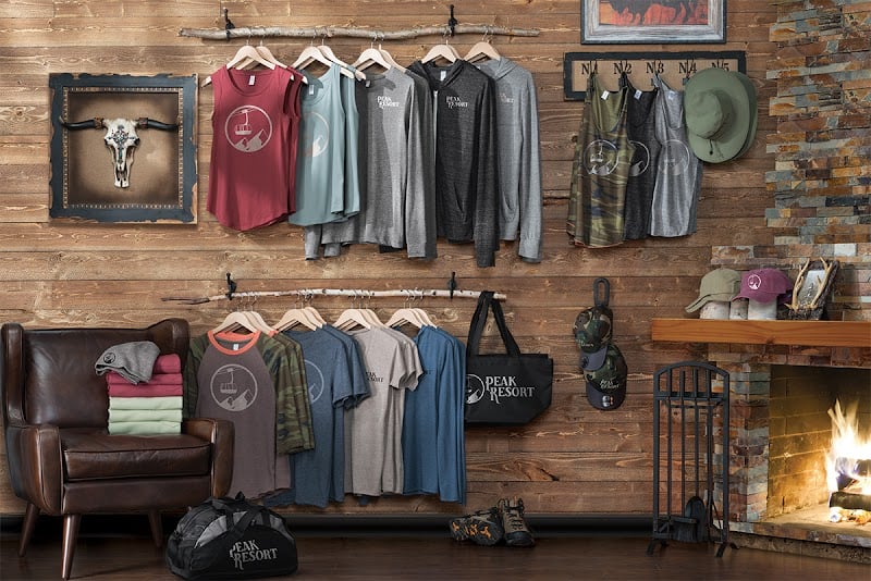 The image showcases a cozy sewing store interior with a wooden wall displaying various custom apparel, including shirts and hats.