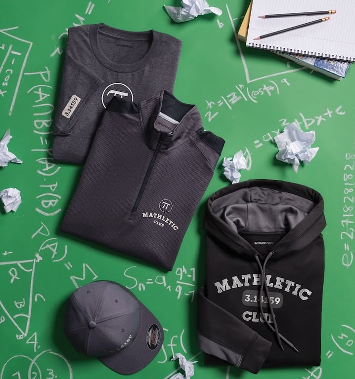 The image showcases three stylish athletic garments, including a t-shirt, a zip-up jacket, and a hoodie, all featuring the "Mathletic Club" logo.