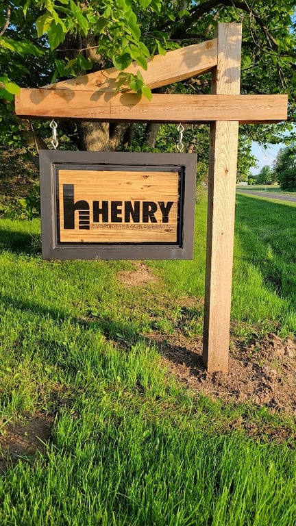 The image features a wooden sign for Henry Embroidery & Screen Printing, prominently displaying the store's name.