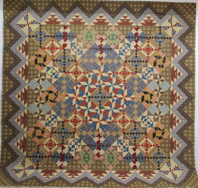A vibrant quilt featuring intricate patterns in red, blue, and gold tones is displayed prominently.