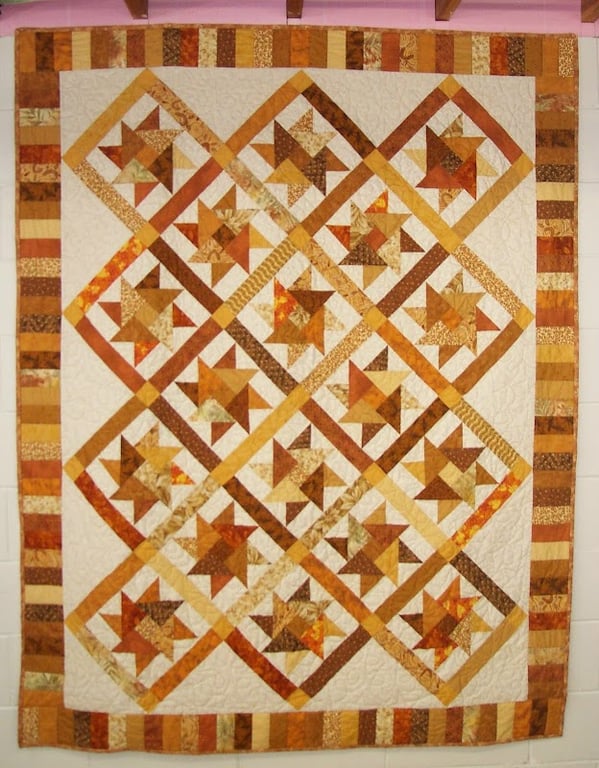 A beautifully crafted quilt featuring a star pattern in warm tones of brown, orange, and cream hangs on a wall in a cozy sewing store.