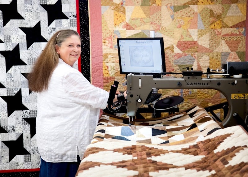 A woman operates a Gammill quilting machine in a vibrant sewing store, surrounded by colorful quilt displays.