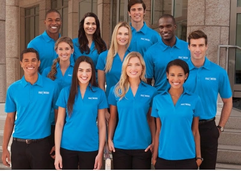 The image features a group of ten individuals wearing matching blue polo shirts, standing together in an outdoor setting.
